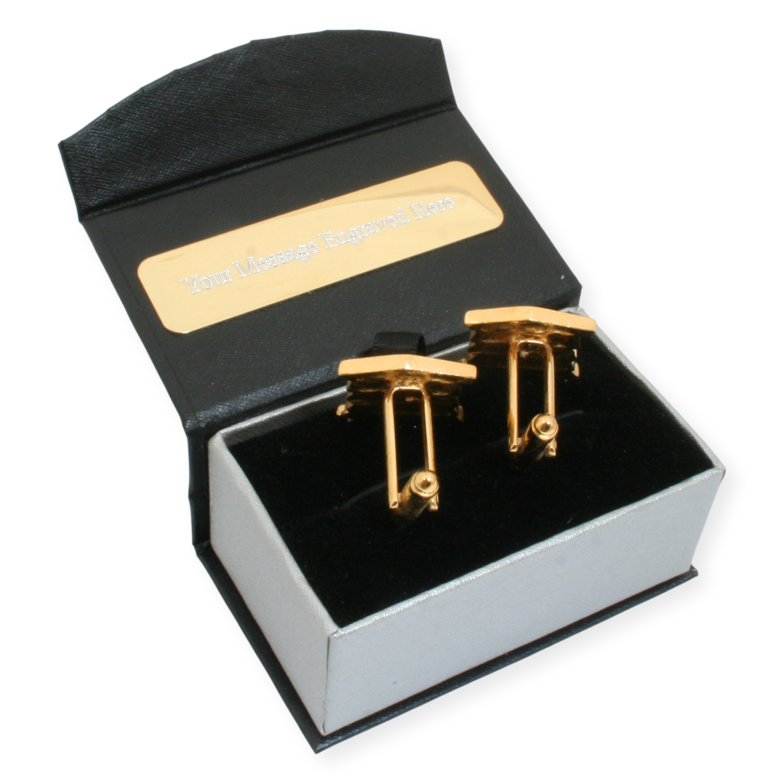 We offer engraving on a gold plaque placed inside the lid of the cufflink box.