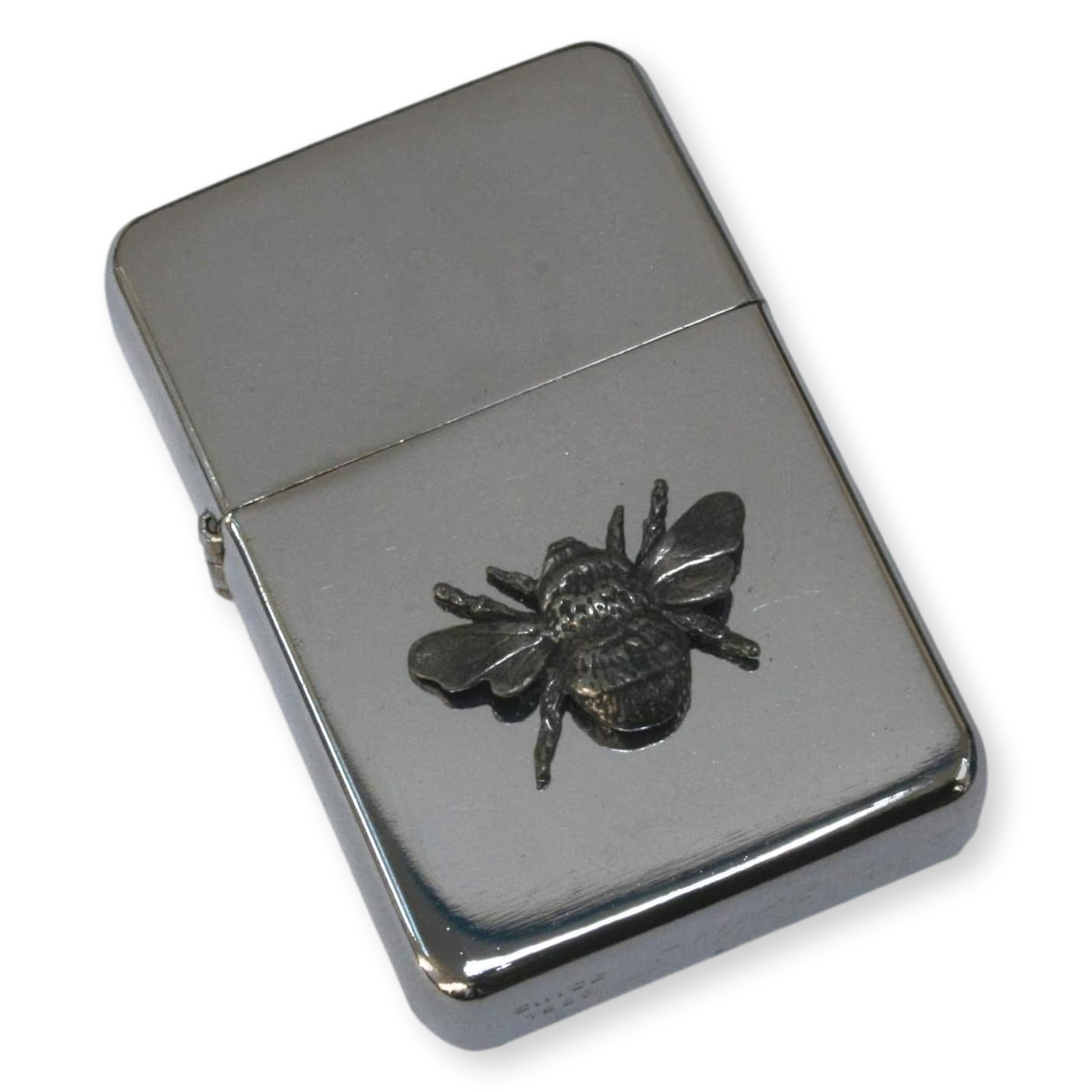 This new petrol lighter features a detailed English pewter or enamel design on the front, as shown in the images. The reverse side is blank, offering space for a personalized engraved message. The lighter comes packaged in a metal tin, making it an ideal gift. The hinged lid opens easily and also serves to extinguish the flame.