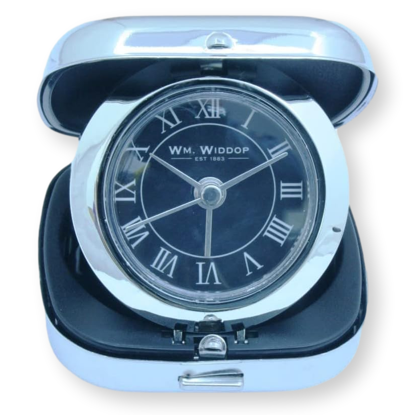 This travel alarm clock, featuring one of our pewter emblems, is an excellent companion for travelers. Compact and portable, it measures 7 cm wide, stands 2.5 cm tall when closed, and extends to 7 cm when open. Powered by a quartz movement, the clock ensures accurate timekeeping and comes with a battery included, so you're always ready to go. You won't have to worry about your phone running out of battery overnight. The clock opens with a simple button press on the front, with the hinge located at the back. It's the perfect gift for anyone who loves to travel.