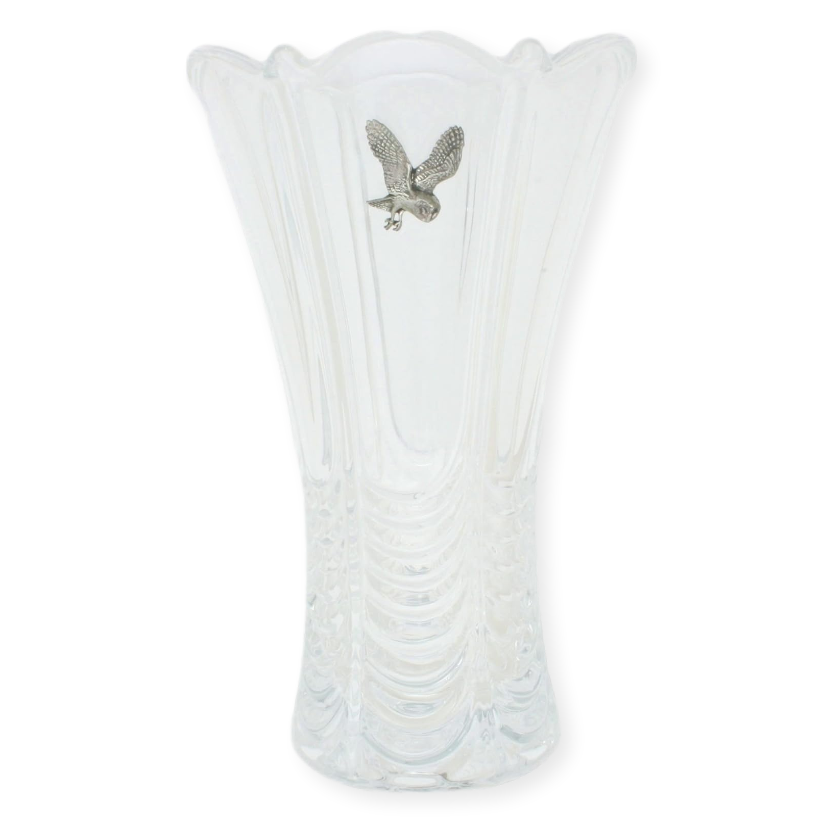 Crystal Glass Vase, ideal for gifting to anyone. Its six-panel fluted design, with a cut pattern at the base. A birds motif on the front panel adds a unique touch.