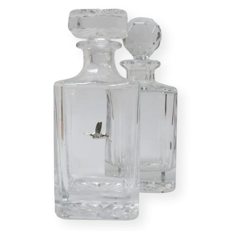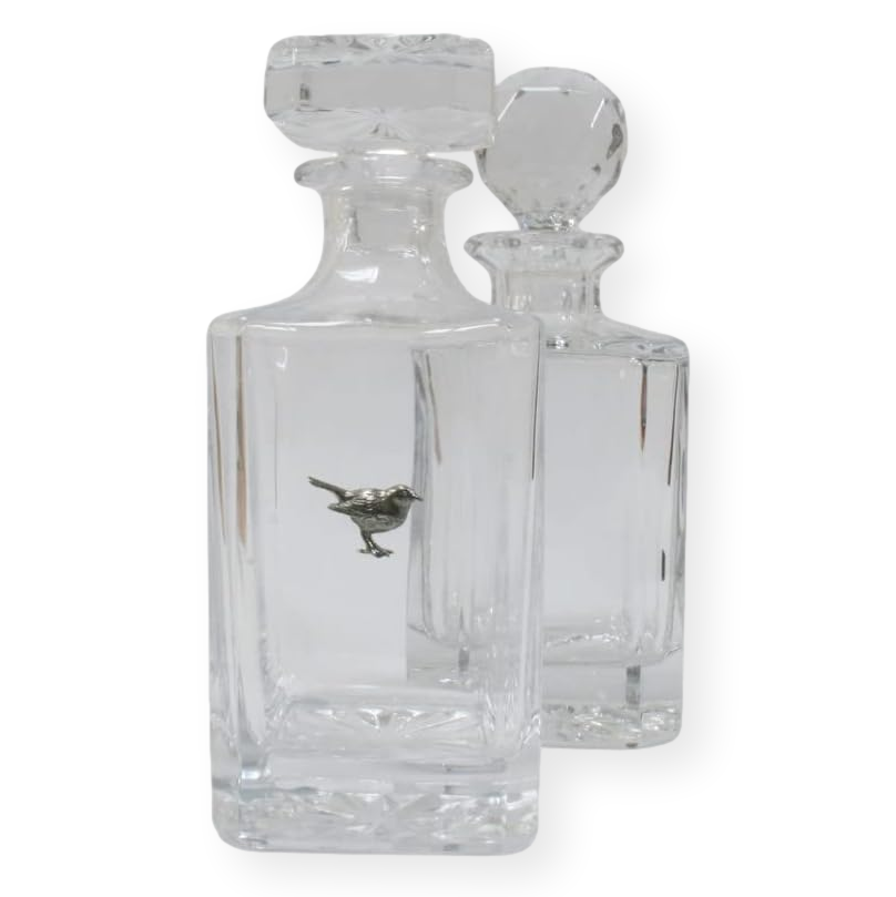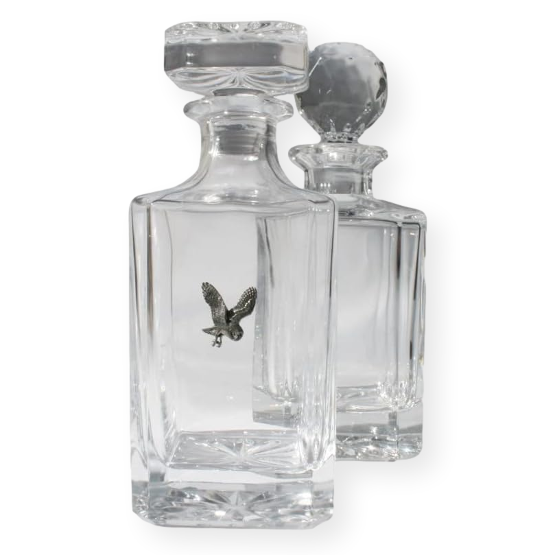 An ideal gift for whiskey drinking enthusiasts, this decanter boasts a square top or classic golf ball-style stopper and a chiseled design along the sides. A locally hand-cast pewter birds motif adorns the front. Perfect as a prize or to complement your spirit collection, it comes in a stylish blue skillet box. With a 750ml capacity (sufficient for an entire bottle of whiskey), it measures 230mm x 100mm x 100mm and weighs 2kg (4.4lbs).