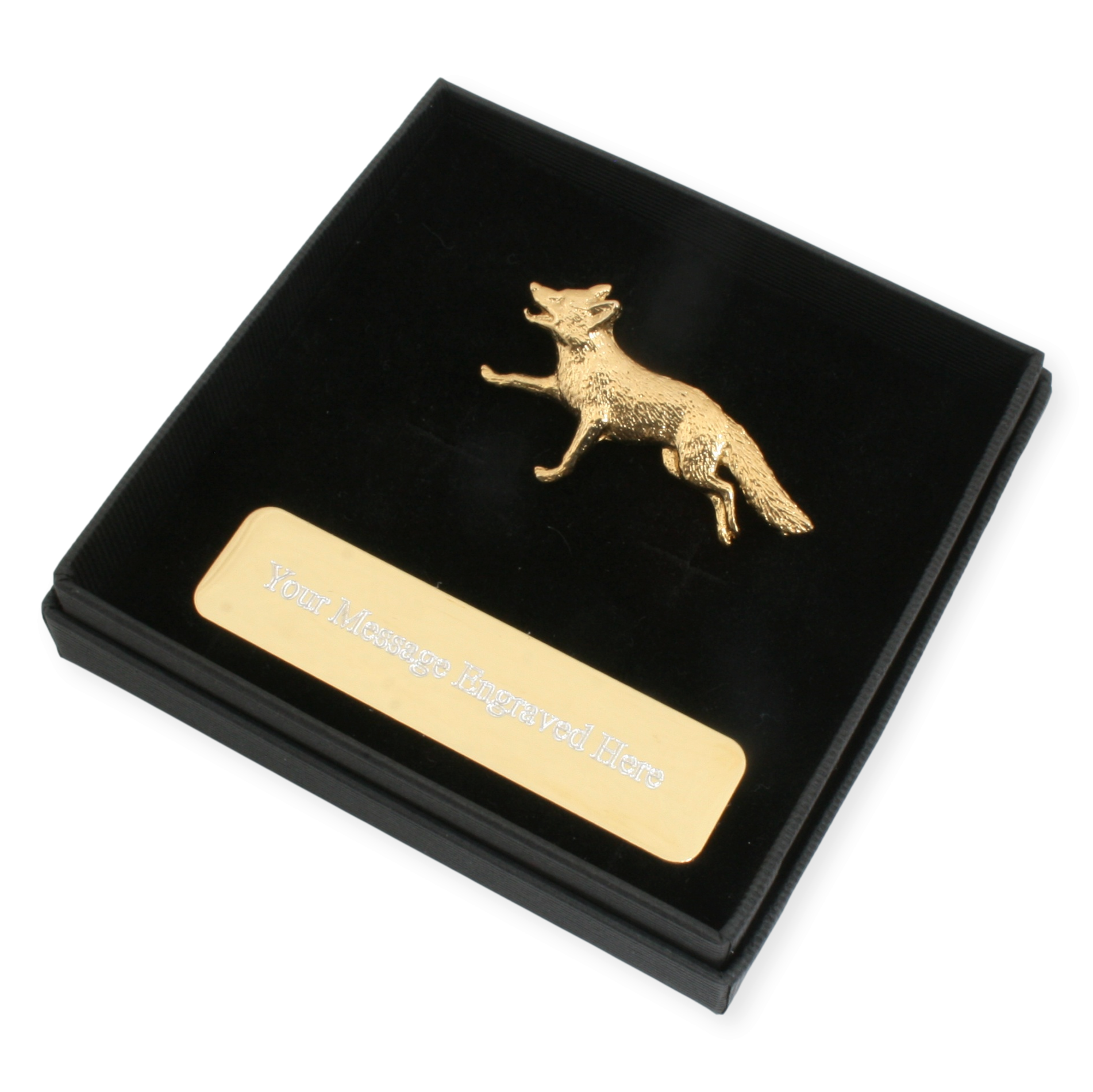 Enhance your collection with our stunning gold Fox Pin Badge, meticulously crafted with 22ct gold plating for a touch of elegance. This sophisticated badge can be customized with optional engraving on the gold plaque.