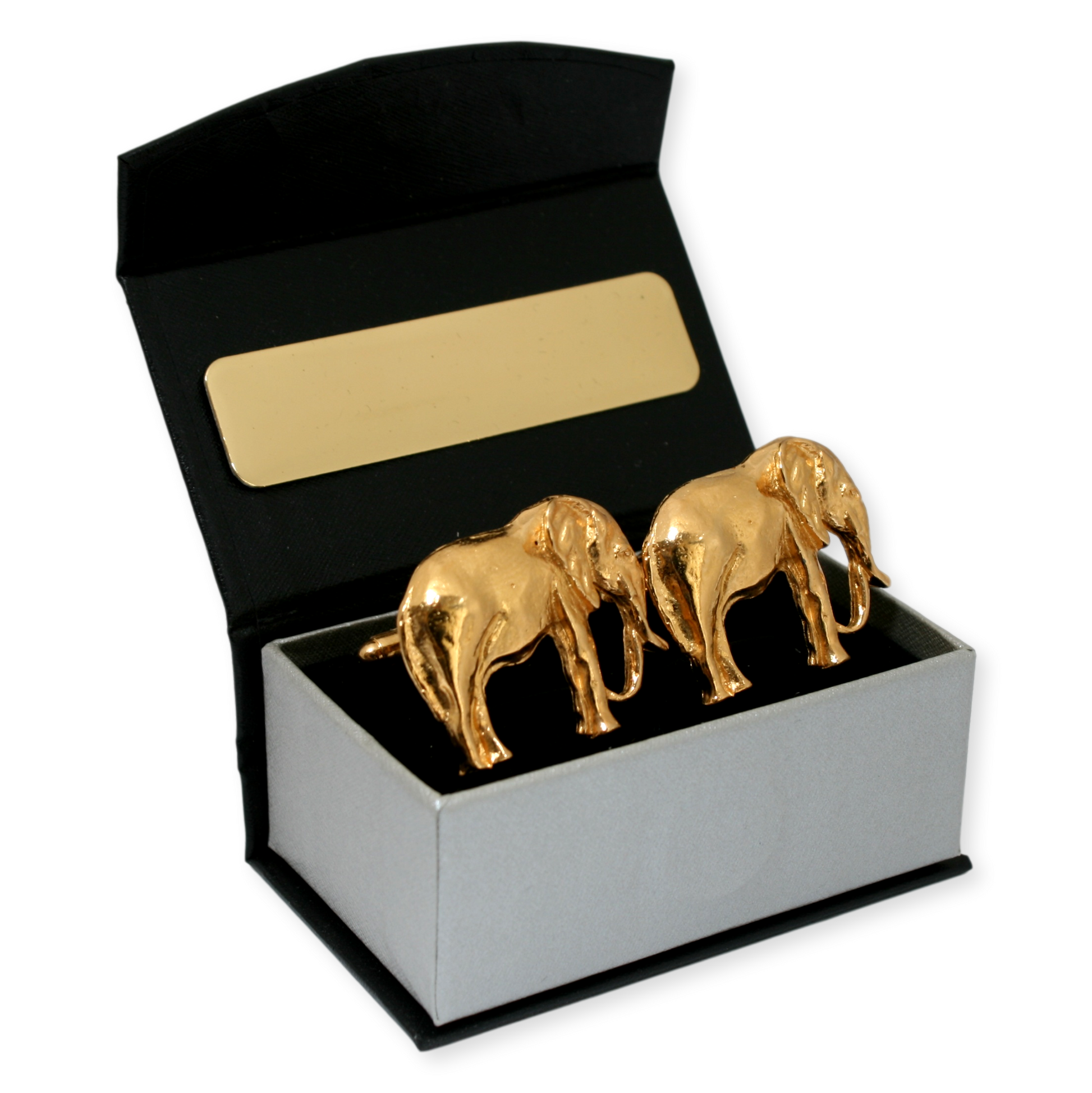 Presented in a sleek black gift box, these gold elephant cufflinks are ready to impress, making them an excellent choice for gifting on any special occasion.