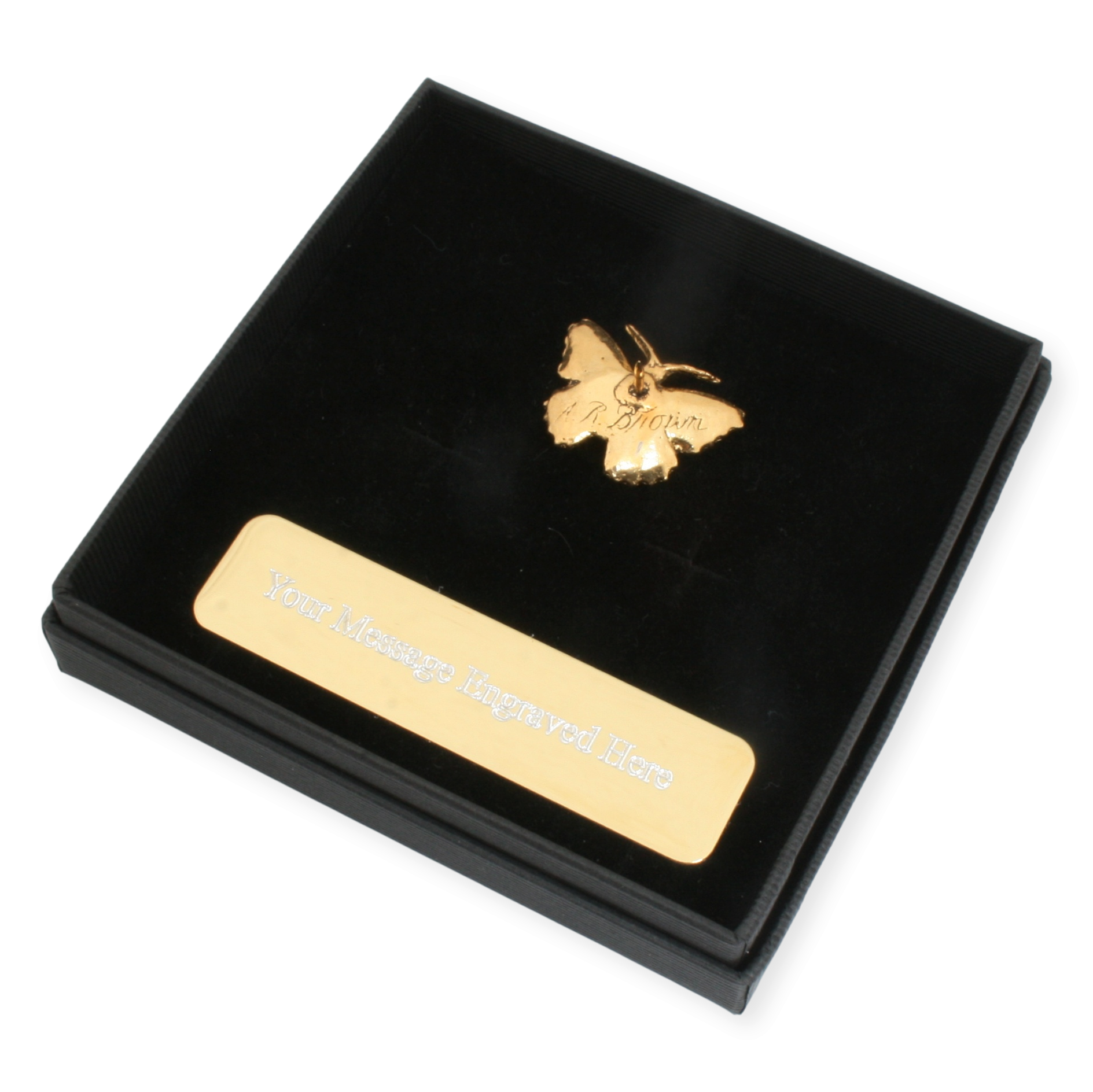 Enhance your collection with our stunning gold butterfly Pin Badge, meticulously crafted with 22ct gold plating for a touch of elegance. This sophisticated badge can be customized with optional engraving on the gold plaque.