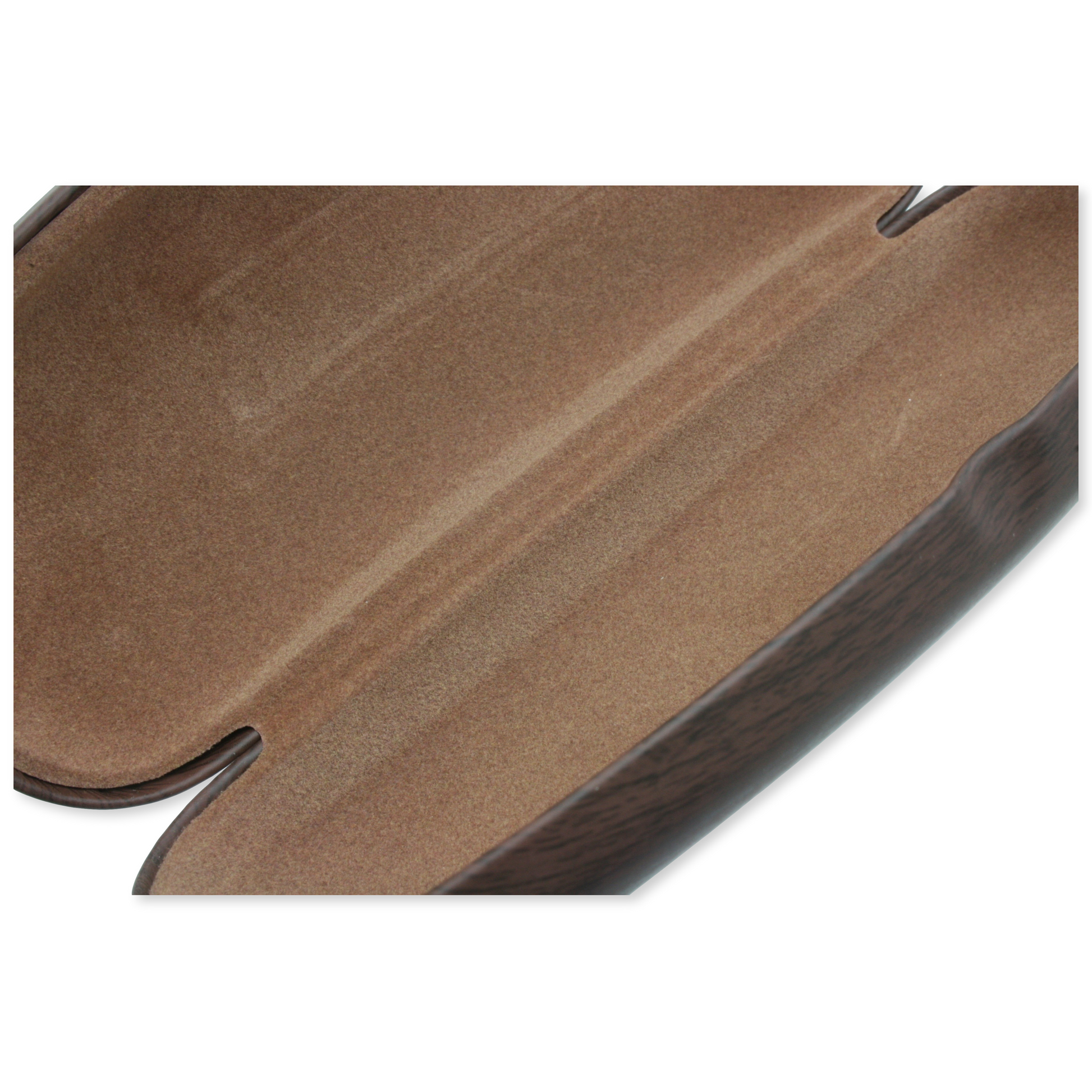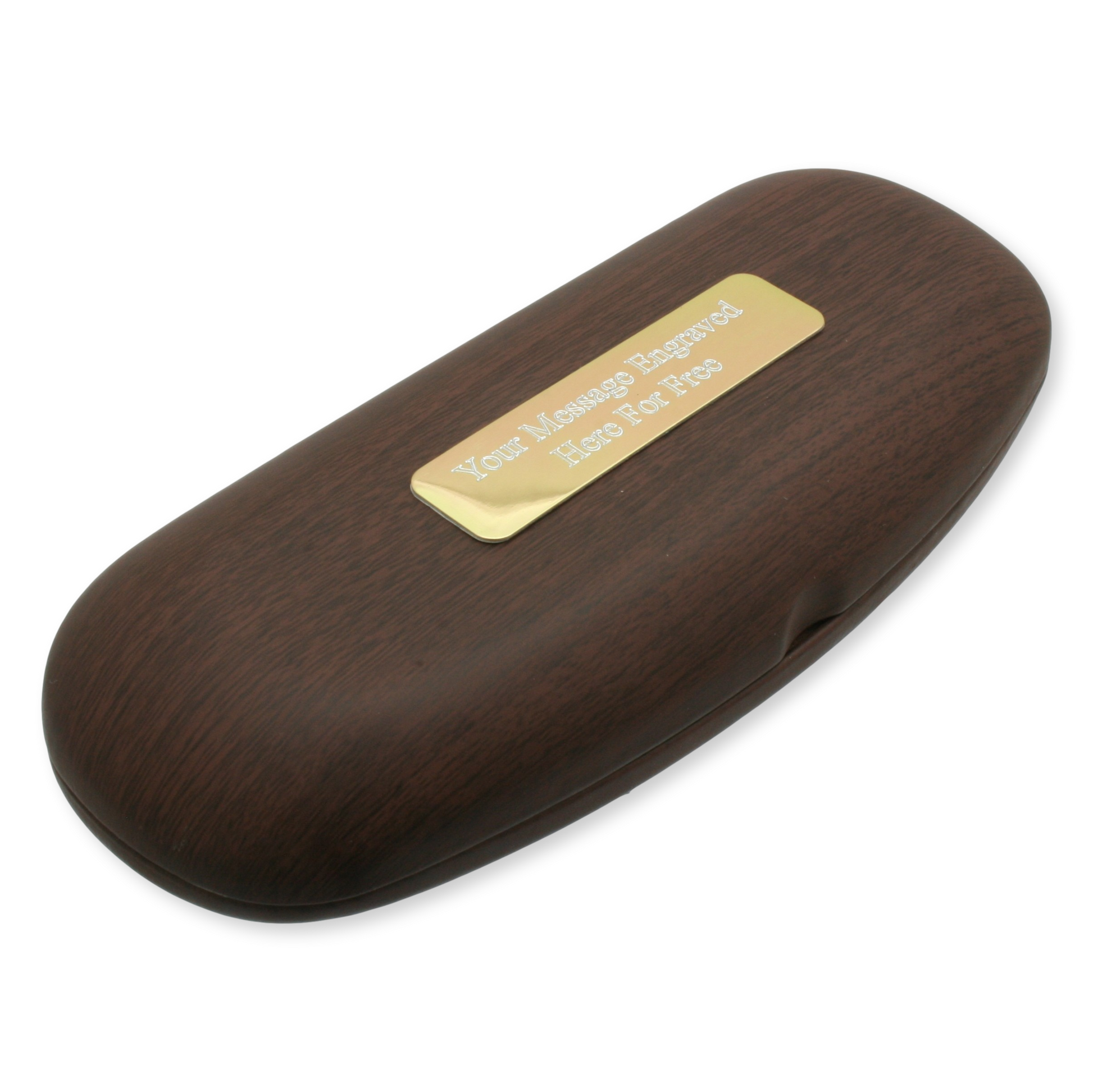 This case is an excellent choice for keeping your glasses safe from damage and scratches. Designed to fit sunglasses, reading glasses, and other eyewear, it offers crush-resistant protection for secure storage. Compact, lightweight, and portable, it's easy to carry in a pocket or bag. The case features a snap-close mechanism and a matching suede interior for a stylish and tactile experience. The exterior showcases an imitation wood vinyl finish, creating a realistic wood effect. On the opposite side, a gold-colored engraving plaque allows for personalization. Simply provide your engraving details. Engraving is done in Times New Roman font and automatically centered for a polished look.