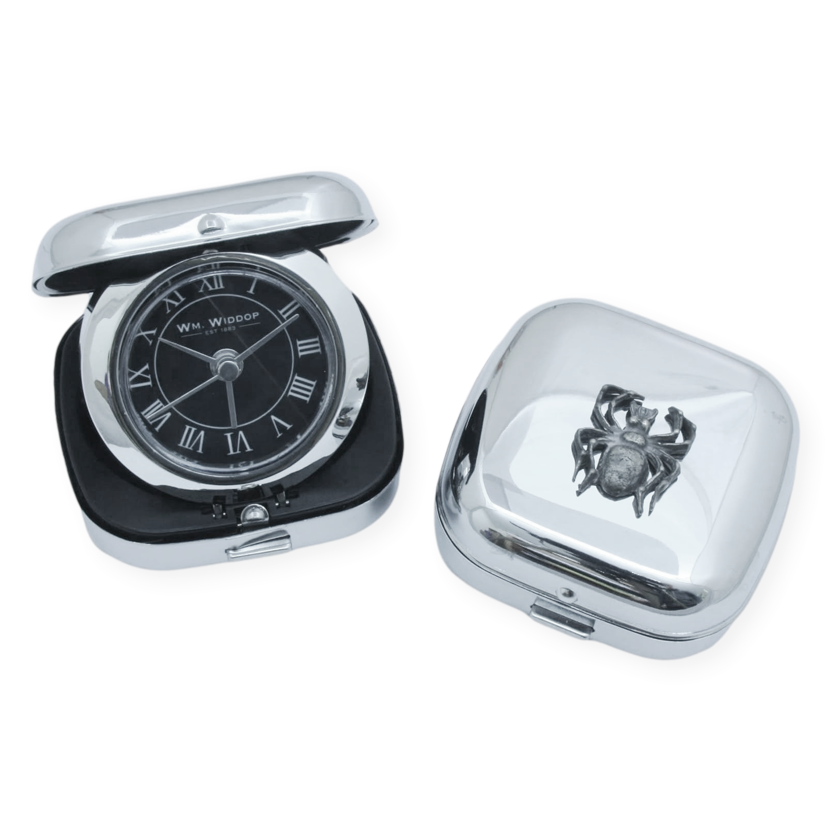 This travel alarm clock, featuring one of our pewter emblems, is an excellent companion for travelers. Compact and portable, it measures 7 cm wide, stands 2.5 cm tall when closed, and extends to 7 cm when open. Powered by a quartz movement, the clock ensures accurate timekeeping and comes with a battery included, so you're always ready to go. You won't have to worry about your phone running out of battery overnight. The clock opens with a simple button press on the front, with the hinge located at the back. It's the perfect gift for anyone who loves to travel.