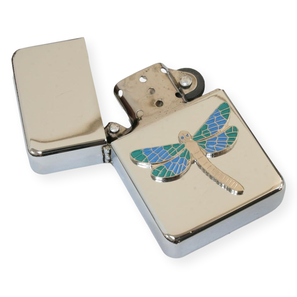 This new petrol lighter features a detailed English pewter or enamel design on the front, as shown in the images. The reverse side is blank, offering space for a personalized engraved message. The lighter comes packaged in a metal tin, making it an ideal gift. The hinged lid opens easily and also serves to extinguish the flame.