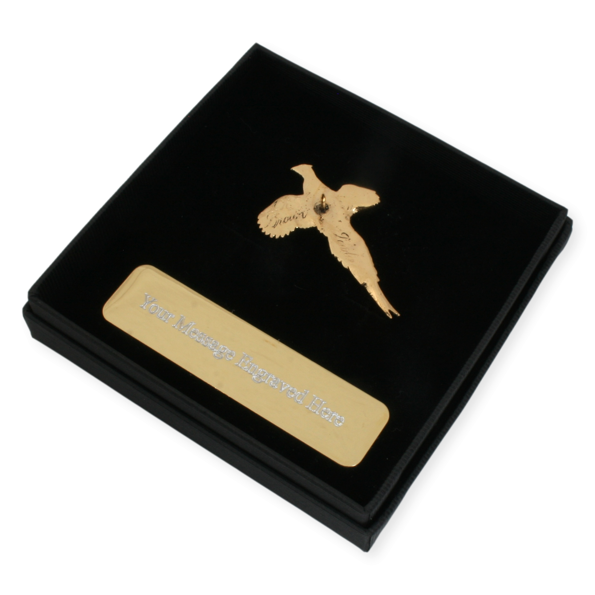 Enhance your collection with our stunning gold Pheasant Pin Badge, meticulously crafted with 22ct gold plating for a touch of elegance. This sophisticated badge can be customized with optional engraving on the gold plaque.