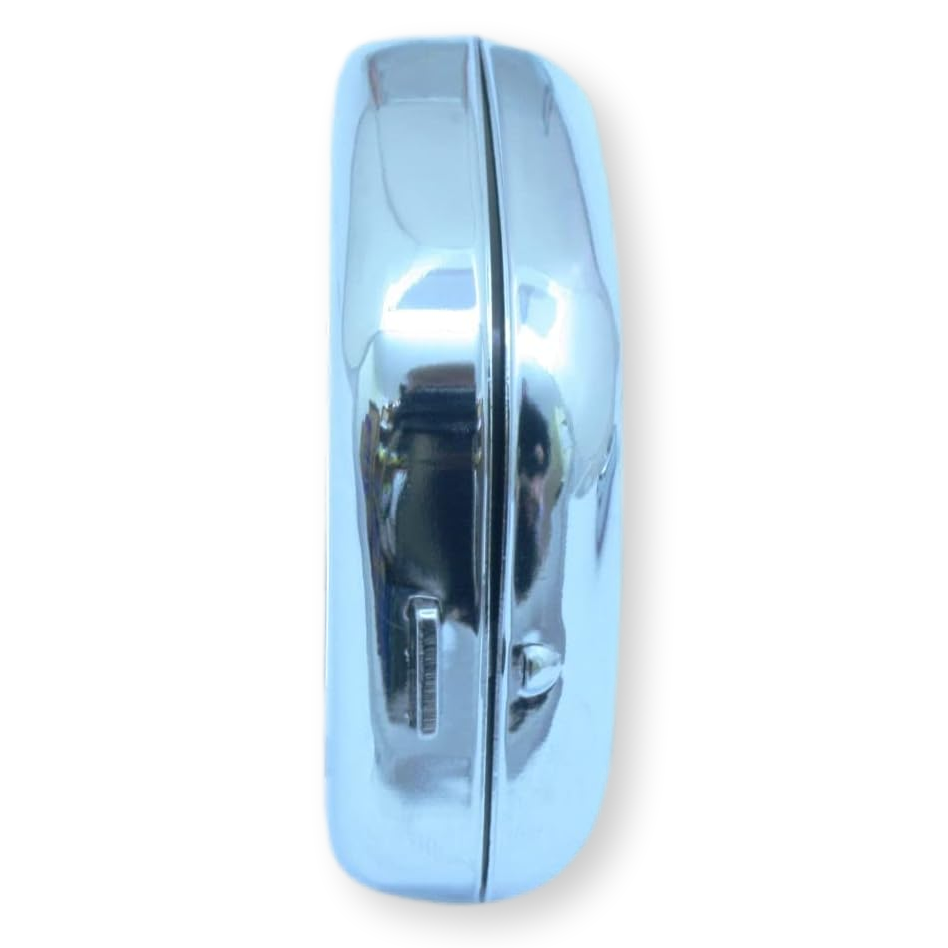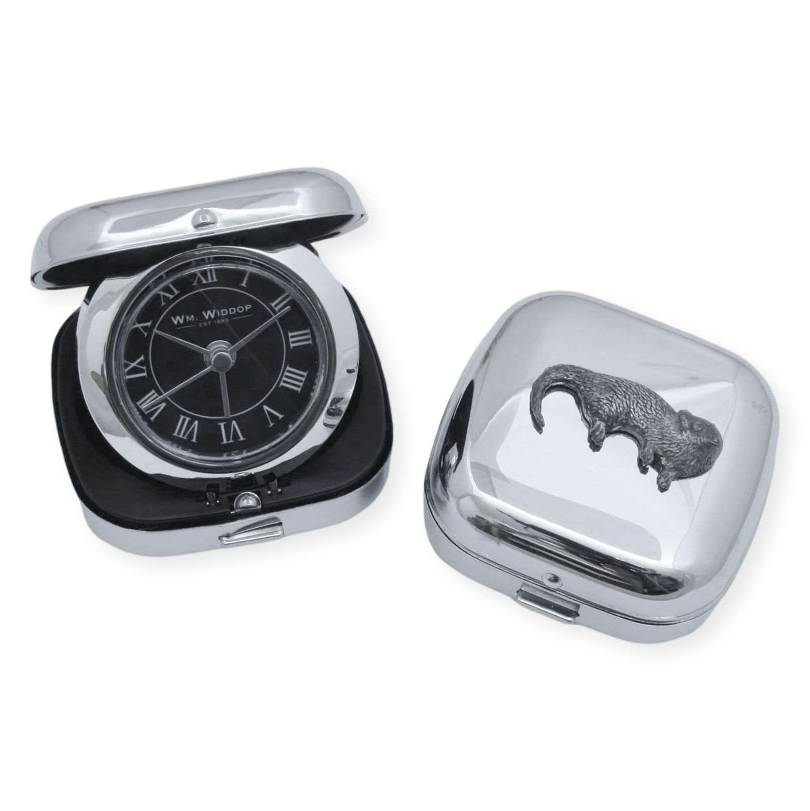 This travel alarm clock, featuring one of our pewter emblems, is an excellent companion for travelers. Compact and portable, it measures 7 cm wide, stands 2.5 cm tall when closed, and extends to 7 cm when open. Powered by a quartz movement, the clock ensures accurate timekeeping and comes with a battery included, so you're always ready to go. You won't have to worry about your phone running out of battery overnight. The clock opens with a simple button press on the front, with the hinge located at the back. It's the perfect gift for anyone who loves to travel.