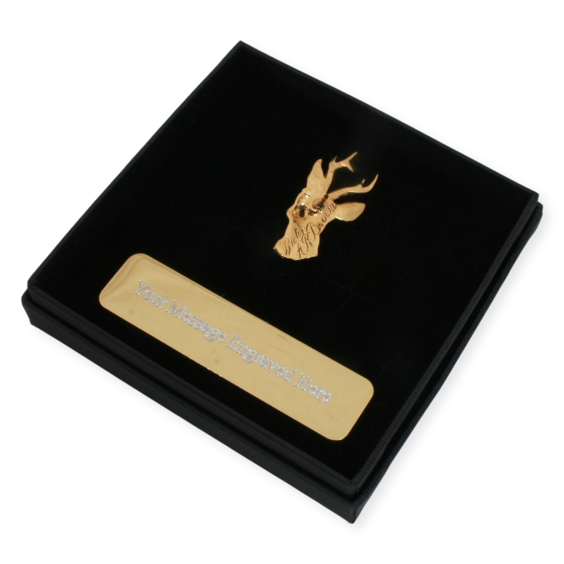 Elevate your collection with our exquisite Gold roe Pin Badge, expertly crafted with 22ct gold plating for a refined touch of elegance. This sophisticated accessory offers the option for personalized engraving on the gold plaque.