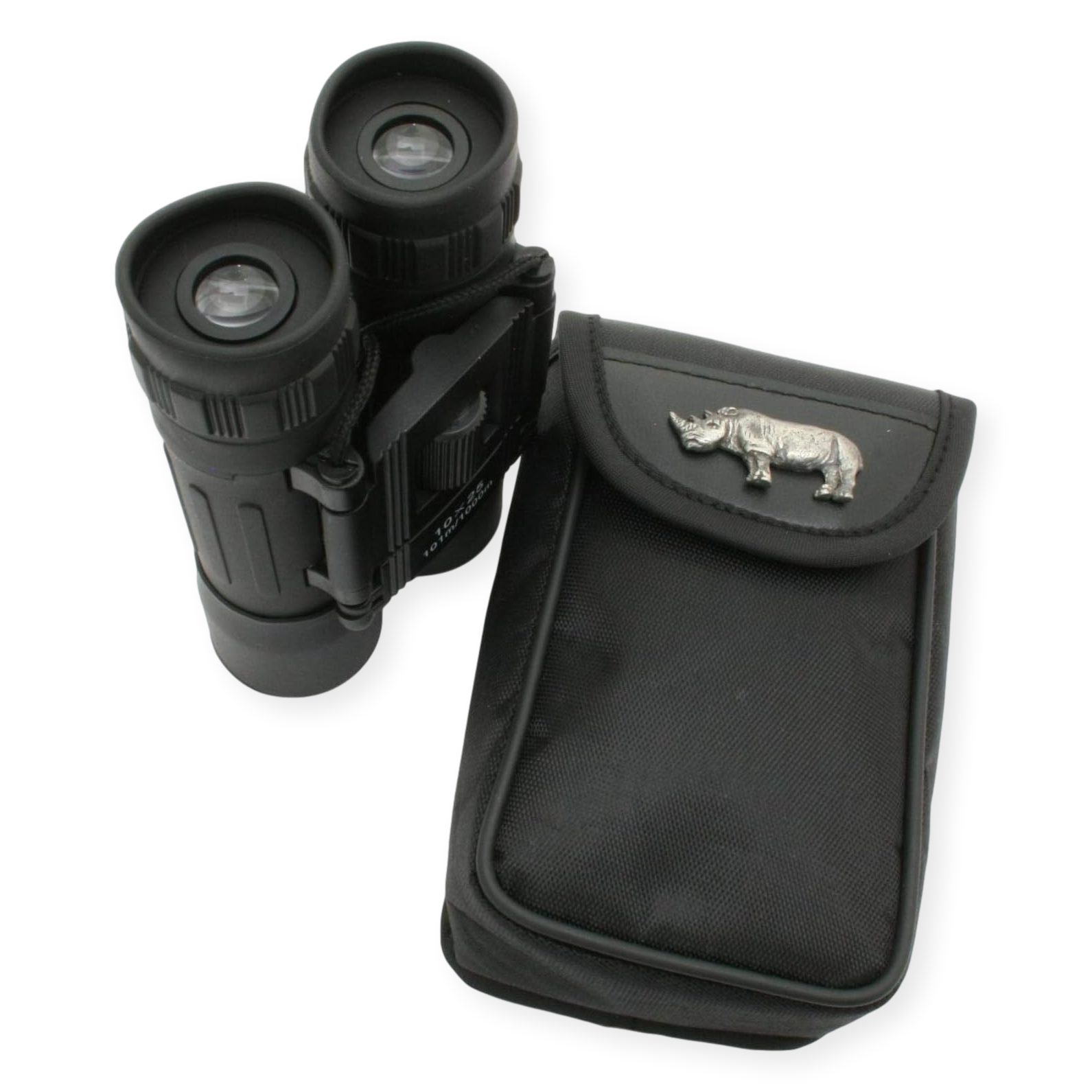 These compact folding binoculars feature 8x magnification and 21mm objective lenses, delivering clear views of objects up to 100 meters away. Equipped with a non-slip central focus wheel and an adjustable diopter for the right eye, they are easy to use, even for younger users. The set includes a pair of binoculars, a cleaning cloth, a neck strap, and a storage pouch. When folded, the binoculars measure 110mm x 90mm x 30mm, and when extended, they measure 90mm x 60mm x 30mm. The storage pouch is adorned with a hand-cast pewter or enamel emblem for a personalized finish. Technical Specifications: MAGNIFICATION - 8X / EYEPIECE DIAMETER - 21mm / VIEWING RANGE - 131m (1000m).