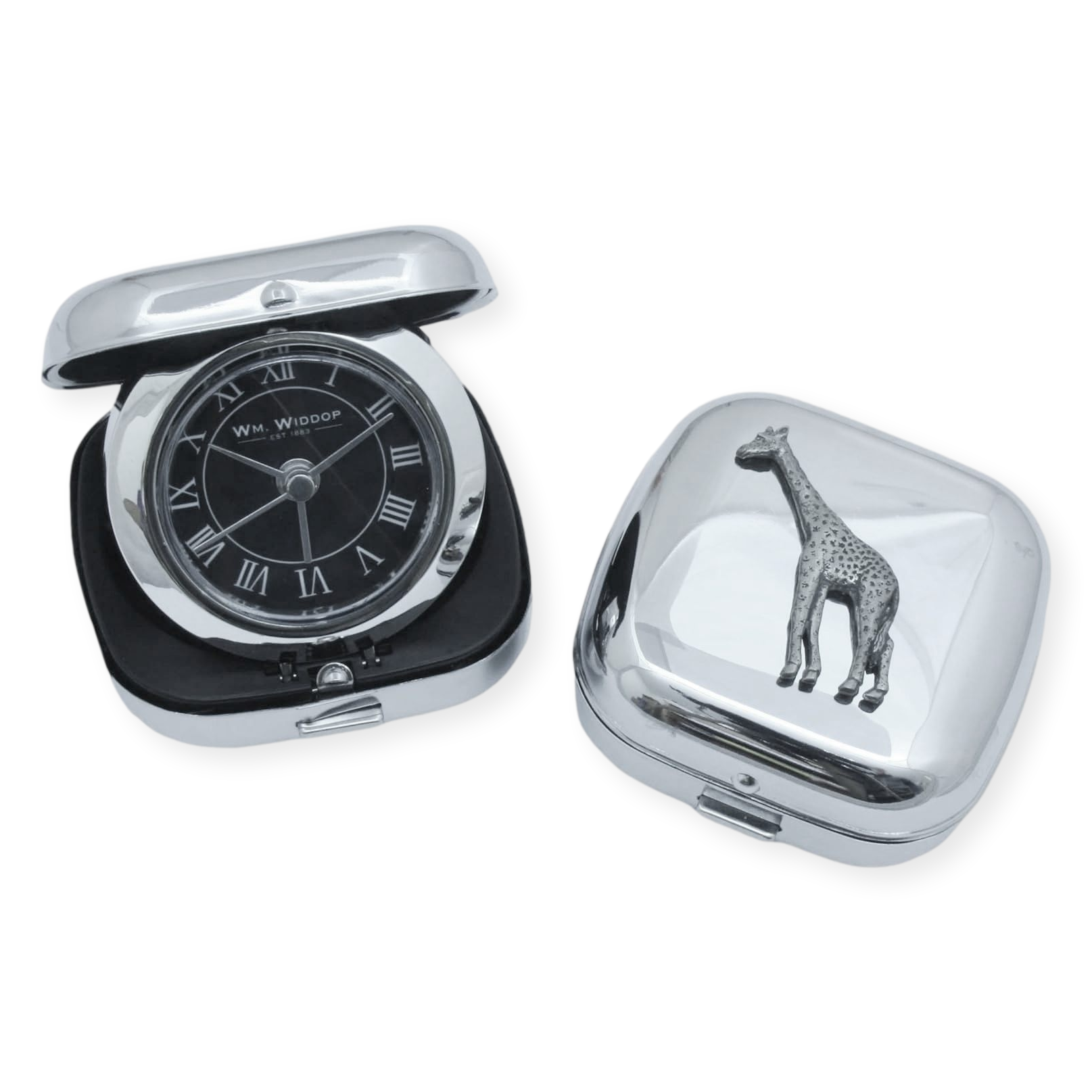 This travel alarm clock, featuring one of our pewter emblems, is an excellent companion for travelers. Compact and portable, it measures 7 cm wide, stands 2.5 cm tall when closed, and extends to 7 cm when open. Powered by a quartz movement, the clock ensures accurate timekeeping and comes with a battery included, so you're always ready to go. You won't have to worry about your phone running out of battery overnight. The clock opens with a simple button press on the front, with the hinge located at the back. It's the perfect gift for anyone who loves to travel.