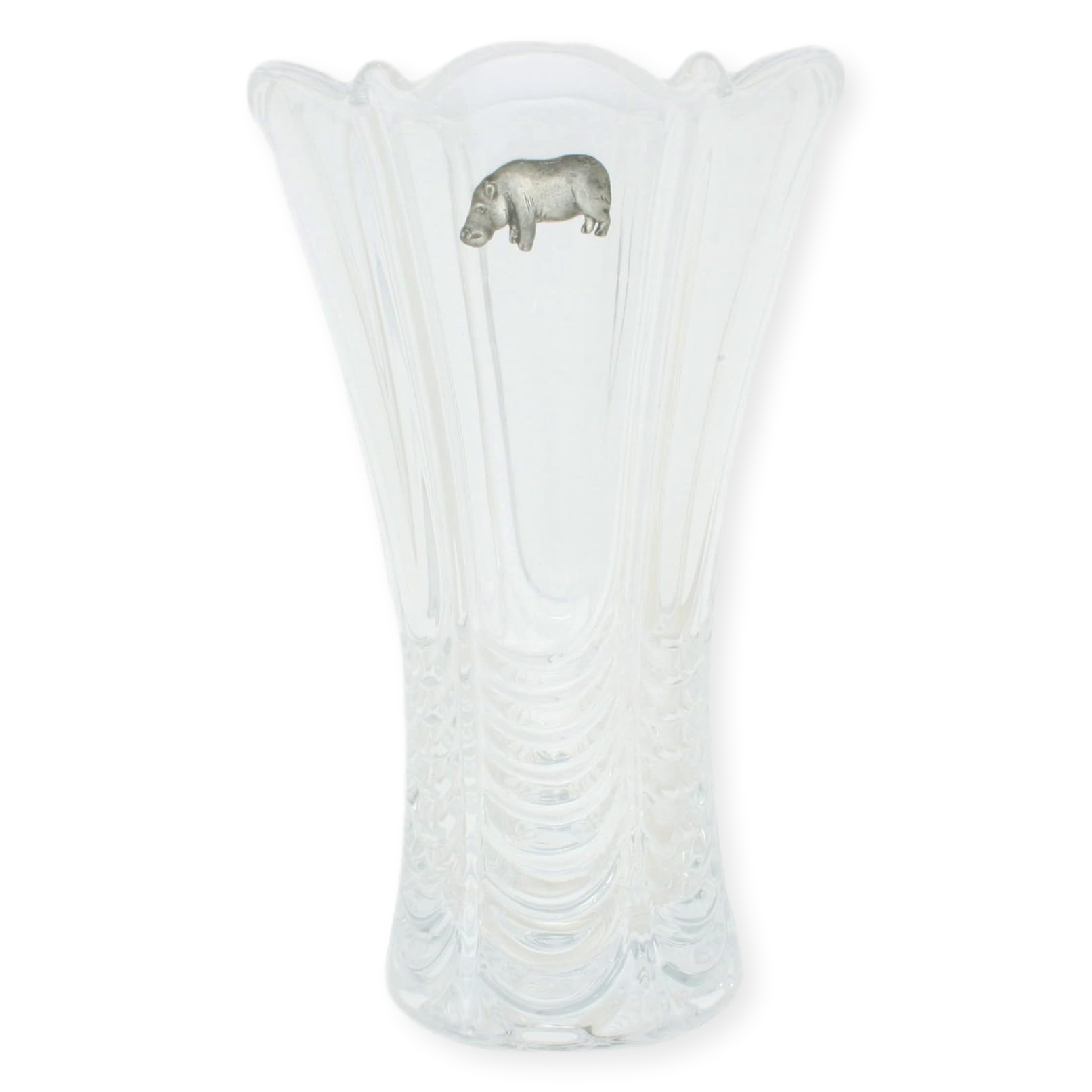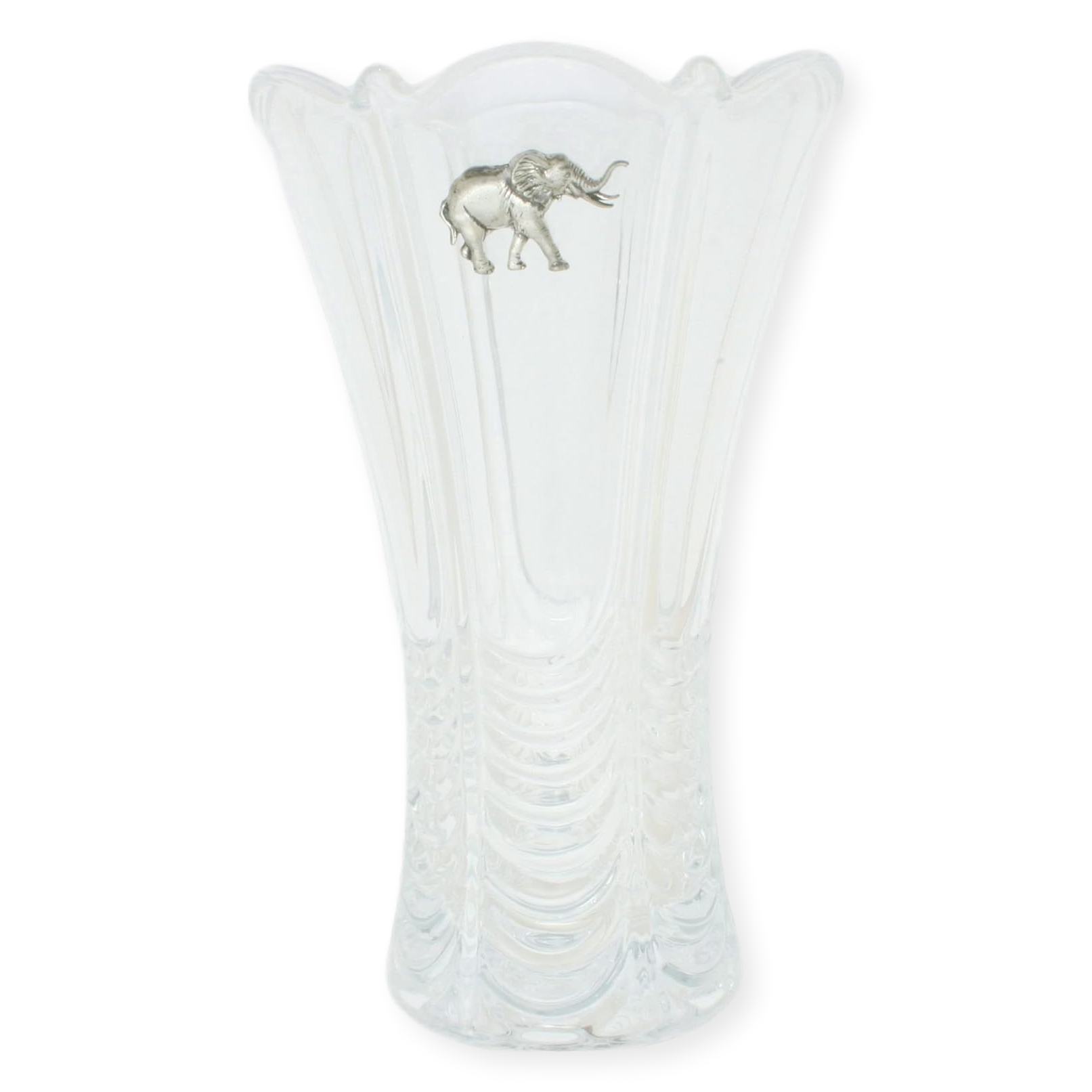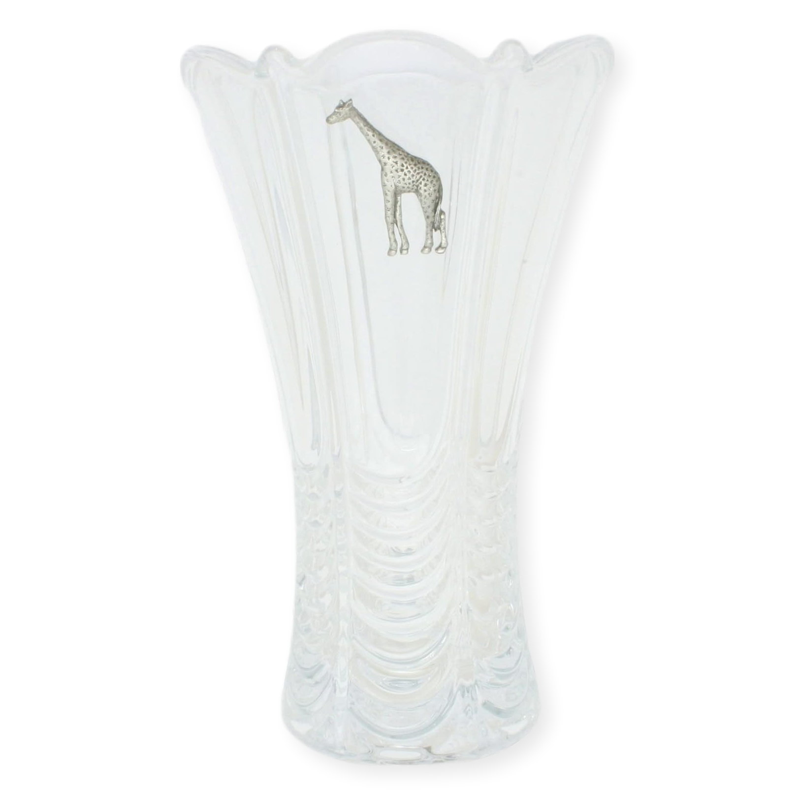 Crystal Glass Vase, ideal for gifting to anyone. Its six-panel fluted design, with a cut pattern at the base. A safari animal motif on the front panel adds a unique touch.