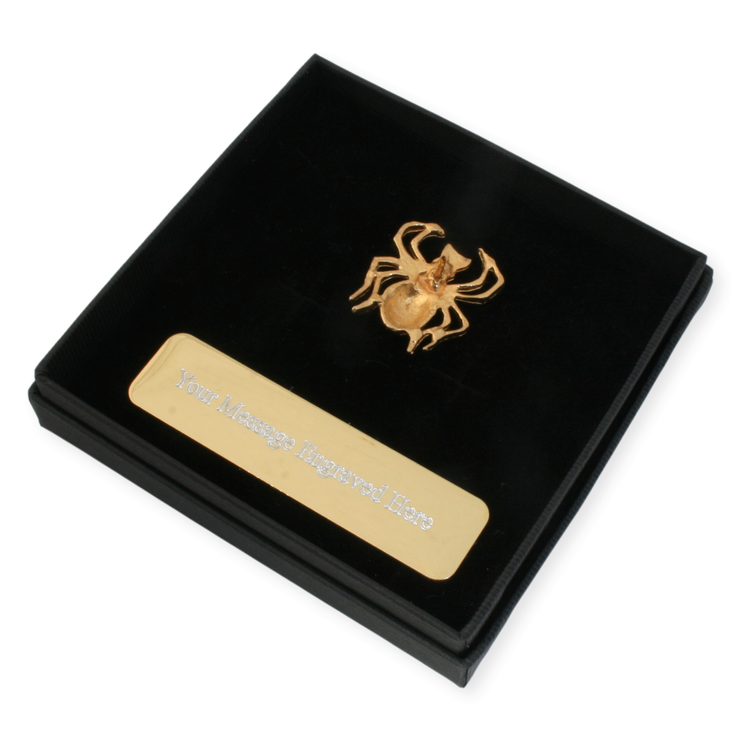 Elevate your collection with our exquisite Gold spider Pin Badge, expertly crafted with 22ct gold plating for a refined touch of elegance. This sophisticated accessory offers the option for personalized engraving on the gold plaque.